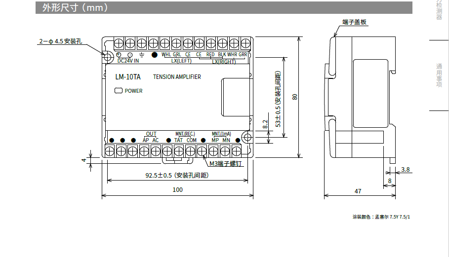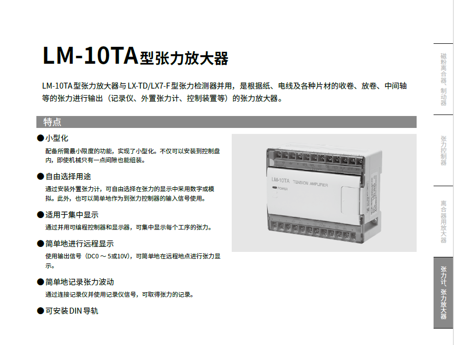 LM-10TA 型張力放大器與LX-TD/LX7-F型張力檢測(cè)器并用,是根據(jù)紙、電線及各種片材的收卷、放卷、中間軸等的張力進(jìn)行輸出(記錄儀、外置張力計(jì)、控制裝置等)的張力放大器。